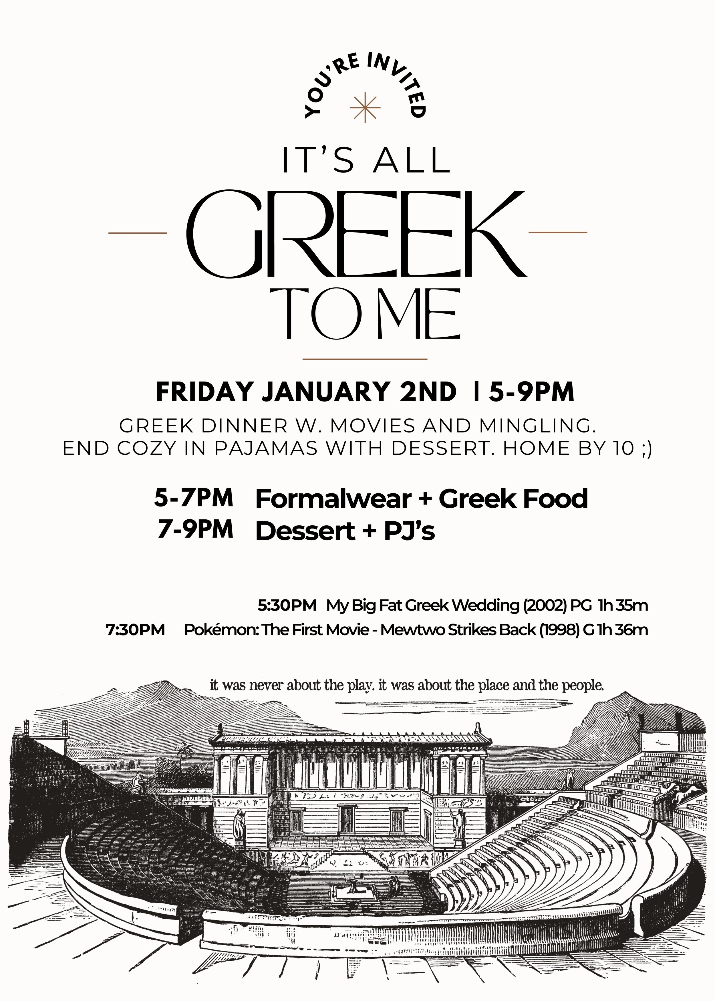 Greek dinner w. movies and mingling.